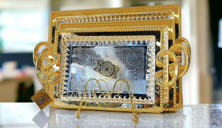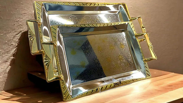 金属托盘由铁或不锈钢制成,有不同的厚度,表面镀有金、银、镍、铬和黄铜。通常,手柄是由锌合金或塑料制成的。